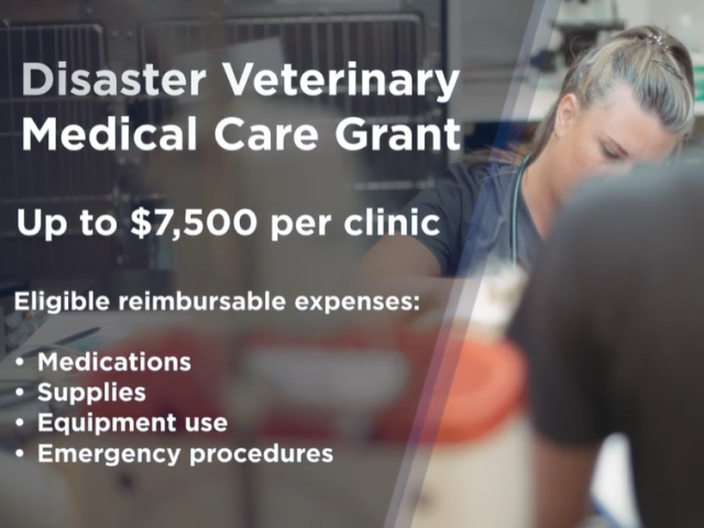AVMF Disaster Reimbursement Grants are for the purpose of ensuring the emergency veterinary medical care of animal victims of a disaster.